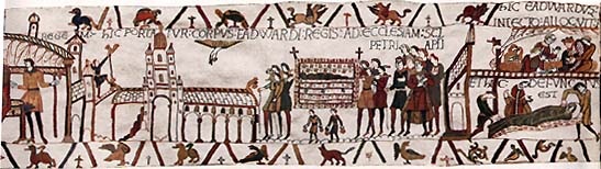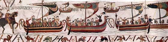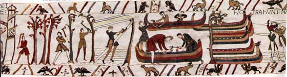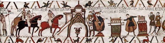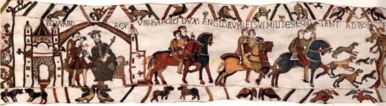 C'est en réalité une broderie de laine sur une bande de toile de lin - 70 m de long sur 0,50m de large - . Dite aussi "Tapisserie de la reine Mathilde"(une légende prétendant que la Reine aurait participé à son élaboration) elle fut probablement brodée en Angleterre entre 1070 et 1080 (?), sur l'ordre de Odon (demi-frère de Guillaume), évêque de Bayeux, pour orner la cathédrale. Cette "Bande Brodée" (ancêtre de la Bande Dessinée) est divisée en 58 épisodes racontant l'histoire de la conquête de l'Angleterre par Guillaume. Elle comporte 626 personnages ! Elle donne de précieux renseignements sur les armes, les vêtements, la nourriture, les navires et en général sur les moeurs de ce "haut Moyen-Age". Elle comporte aussi, dans les parties supérieure et inférieure, de nombreux symboles encore très mystérieux. Elle est exposée à Bayeux (Normandie) dans un Musée qui lui est spécialement consacré. Voici, ci-dessous, quelques uns des principaux épisodes : |