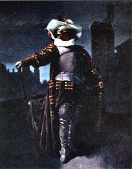En Décembre 1897, au théâtre de la porte Saint-Martin, à Paris, la pièce d'Edmond Rostand, "Cyrano de Bergerac", remporte un triomphe dont l'apport de nouveauté n'est pas sans rappeler la "première" du Cid, de Corneille, en 1636. Ce succès ne s'est pas démenti depuis et toutes les "recréations" au théâtre et au cinéma ont toujours été des réussites. Mais, si la trame de la pièce est bien la base du véritable personnage, quelles sont les parts de vérité et de fiction entre le théâtre et l'Histoire ? Ci-contre : COQUELIN l'aîné, à la création de "CYRANO DE BERGERAC", d'Edmond ROSTAND, en 1897 |