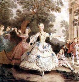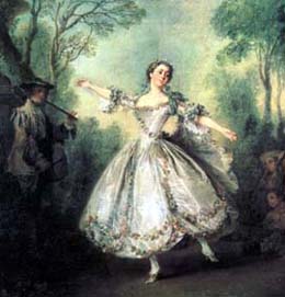 Le Ballet de Théâtre A partir de 1672, Lully s'associe ave le décorateur des fêtes de la Cour Vigarani , au chorégraphe Beauchamp * et au librettiste Quinault pour créer un genre nouveau : le drame musical dans lequel les genres se mélangent (musique, chant, danse, comédie) tels Thésée, Athys, Acis et Galatée, Psyché,... Ce sont les débuts de l'Opéra-Ballet qui s'épanouira lors du siècle suivant avec des musiciens comme Rameau ("Les Indes galantes") et des danseurs tels Ballon, Dumoulin, Dupré et Vestris. Les danseuses, elles, empêtrées dans des robes à paniers et des coiffures emperruquées ne peuvent rivaliser avec leurs homologues masculins. Heureusement de grandes danseuses comme La Camargo et Marie Sallé ont le courage de raccourcir les robes, de simplifier leurs tenues et coiffures afin d'être plus libres pour s'exprimer. Ce n'est qu'à partir de ce moment que l'équilibre entre la danse masculine et la danse féminine pourra se réaliser... en attendant que la seconde prenne le pas sur la première ! * Musicien, danseur et chorégraphe Beauchamp est probablement aussi l'inventeur des cinq positions fondamentales de la danse qu'il s'applique aussi à codifier car les pas sont déjà nombreux : glissés, jetés, coupés, chassés, entrechats,... |