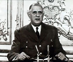 Dans la nuit du 21 au 22 Avril 1961, d'anciens Généraux, alliés aux algérois, toujours ceux essentiellement de souche européenne, tentent de soulever l'Armée. Le dimanche soir 23 avril, De Gaulle apparaît en uniforme à la télévision et déclare : «Un pouvoir insurrectionnel s'est installé en Algérie par un pronunciamiento militaire. Ce pouvoir a une apparence : un quarteron de généraux en retraite... Au nom de la France, j'ordonne que tous les moyens, je dis tous les moyens, soient employés pour barrer la route de ces hommes-là... J'interdis à tout Français et d'abord à tout soldat d'exécuter aucun de leurs ordres...». Le 25 tout rentre dans l'ordre ; les militaires n'ont pas bougé ; les chefs insurgés se rendent ou s'exilent. |