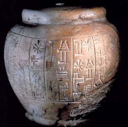 Les SUMERIENS et l'Ecriture cunéiforme (signes composés de coins, car tracés, au début, avec un stylet ou calame en roseau à pointe biseautée, sur des tablettes d'argile) Au départ, simples pictogrammes, puis, de plus en plus élaborés, idéogrammes, preuve de la démarche intellectuelle des hommes vers l'abstraction. ![]() |