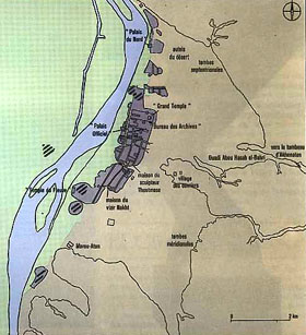 A la mort d'AMENOPHIS III, la rupture avec le Clergé d'Amon sera très vite consommée, mais on ne peut pas dire que la raison en soit uniquement politique. AMENOPHIS IV, en quête incessante de spiritualité, voue une adoration unique à Aton. Il va d'ailleurs changer son nom d'AMENOPHIS IV en AKHENATON -"le profitable au disque"(solaire)-. De plus, afin de rompre totalement avec les anciens cultes, il décide de fonder une nouvelle capitale, en moyenne-Egypte, Akhet-Aton -"l'horizon du disque- (actuellement connue sous le nom de Tell-el-Amarna), où il fait bâtir des temples, sans toit, dédiés au dieu solaire, des palais et des maisons somptueusement et délicatement décorés - c'est la naissance de l'Art amarnien -, des bâtiments administratifs,... Toute la cour et l'administration s'y transportent, abandonnant Thèbes. |