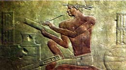 Dans sa main droite il tient le calame (tige de roseau taillée); à proximité il a sa palette creusée de plusieurs godets qui reçoivent les encres noire et rouge. Devant lui il tient ou pose le papyrus sur lequel il va écrire. Celui-ci a été fabriqué par des artisans spécialisés avec des tiges de pâpyrus (roseau) taillées en fines lamelles collées en couches perpendiculaires, aplaties, lissées et sèchées. Souvent on relie entre elles les feuilles ainsi obtenues pour en faire des rouleaux. Cette fabrication étant délicate revient cher et le papyrus n'est pas employé pour l'usage courant. On utilise souvent des tessons de poteries (ostraca) sur lesquels on grave avec un stylet. C'est grâce aux hiéroglyphes gravés ou peints dans les temples et les tombeaux ainsi qu'à ceux des papyrus retrouvés dans les tombeaux que nous avons connaissance de l'Histoire et de la Vie de l'Egypte ancienne ... encore fallait-il pouvoir les lire ! A ce propos voir : Champollion et les hiéroglyphes. |