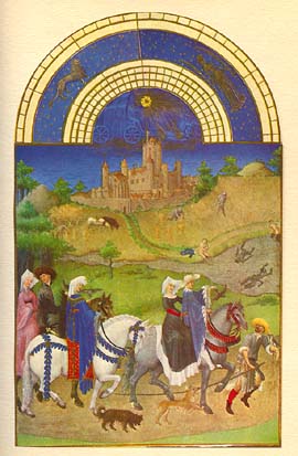 * * * Zodiaque : Lion, Vierge AOÛT En fond le château d'Etampes, propriété de Jean de Berry. A l'arrière plan des paysans moissonnent et des jeunes gens se baignent dans la rivière. Devant cavaliers et cavalières (lesquelles montent "en amazone") partent à la chasse avec les faucons. * * * |
