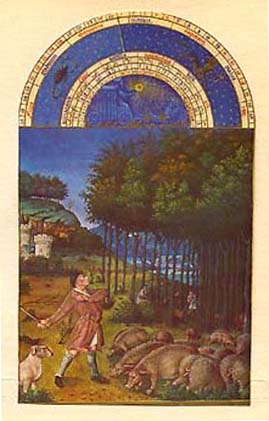 * * * Zodiaque : Scorpion, Sagittaire NOVEMBRE Dans un paysage vallonné le gardien des porcs lance son bâton dans les chênes afin de faire tomber les glands qui vont nourrir ses bêtes. Cette peinture n'est probablement pas due aux frères Limbourg mais à Jean Colombe. Le style est plus sec et les couleurs assez violentes. * * * |