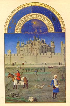 * * * Zodiaque : Balance, Scorpion OCTOBRE De nouveau à Paris, toujours vu de l'hôtel de Nesles, le Louvre de Philippe-Auguste, aménagé par Charles V. C'est la saison des semailles... Malgré l'épouvantail (au centre), les corbeaux et les pies, au premier plan à gauche, picorent des grains que sème le paysan, avant qu'ils ne soient recouverts par la terre grâce à la herse tirée par l'homme sur le cheval. * * * |