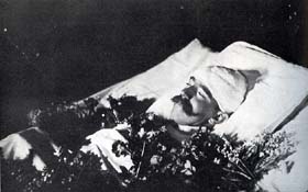 ![]() Rodolphe, sur son lit de mort * Le 5 Février 1889, il fut inhumé dans le tombeau des Hasbourg, dans l'église des Capucins, à Vienne. * ( Le 1er Février, Marie Vestera avait été enterrée, quasi clandestinement, dans un petit cimetière proche de Mayerling. ) * |