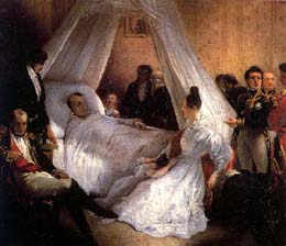 Au début de sa captivité il réagit assez bien mais, peu à peu, l'action lui manque, les tracasseries du Gouverneur le fatiguent et le climat délétère vont altérer sa santé. Au début de 1'année 1821 son état s'aggrave. Il dicte son testament à Montholon. Le 5 Mai celui qui avait été le "maître du monde" rend le dernier soupir. |