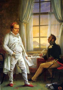 Le 15 juillet, à Rochefort, il se met sous la protection des Anglais dont il "sollicite l'hospitalité" et monte à bord du Bellérophon qui fait voile pour Plymouth. C'est là qu'il apprend qu'il sera déporté à Sainte-Hélène, petite ile tropicale de l'Atlantique sud, non plus comme souverain de l'ile mais comme prisonnier de l'Angleterre. Il y aborde le 17 Octobre 1815. Il a la permission d'emmener seulement quelques compagnons, tels Montholon, Las Cases, Bertrand et leurs familles. ![]() ![]() Les généraux Bertrand et Montholon |