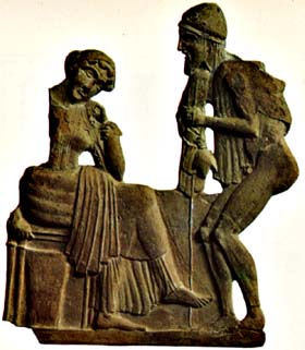 Ulysse de retour dans son île retrouve son fils Télémaque et aidé par celui-ci, par son fidèle porchér Eumée et surtout par la déesse Athéna, il massacre les "prétendants" qui souhaitaient prendre ses biens et épouser sa fidèle Pénélope qui l'attendait depuis vingt ans (dix ans de guerre à Troie et dix ans pour le retour) ! Ces "prétendants" étaient peut-être les créanciers qui avaient prêté de l'argent à Ulysse pour armer ses soldats et ses navires afin de partir en guerre contre les Troyens et qui, ne le voyant pas revenir, souhaitaient se rembourser sur le domaine du roi, lequel avait peut-être volontairement organisé cette expédition pour rapporter ces métaux précieux pour l'époque, le cuivre et l'étain... |