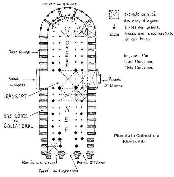 A l'époque romaine, à cet emplacement, sur l'île de la Cité, s'élevait peut-être déjà un temple qui pourrait avoir aussi été lié aussi à un ancien culte gaulois (?). Au V°siècle, sur ses ruines fut bâtie la basilique Saint-Etienne, agrandie aux VI° et VII°siècles sous le vocable Notre-dame , détruite au début du IX°siècle par les Normands et reconstruite quelques années plus tard ! En 1163, sous le règne de Louis VII, l'évêque Maurice de Sully demande au pape Alexandre III de poser la première pierre d'une nouvelle cathédrale. Aux alentours de 1200, la cathédrale est entièrement voûtée en arcs d'ogives (nouveauté par rapport aux précédents arcs romans), mais la fragilité des murs, la voûte s'élevant à 35m, oblige à une nouvelle innovation, ce sont les arcs boutants. Vers 1220, la cathédrale s'élève jusqu'à la "galerie des rois". En 1250, les tours sont achevées. Ce n'est qu'un peu avant le milieu du XIV°siècle que l'édifice est achevée. Au XIX°siècle la cathédrale, victime en particulier de la Révolution, menace ruine. Louis-Philippe confie à Viollet-le-Duc sa restauration. Entres autres choses, la flèche est refaite et portée à 90m de haut., les statues et portails de façades restaurés. |